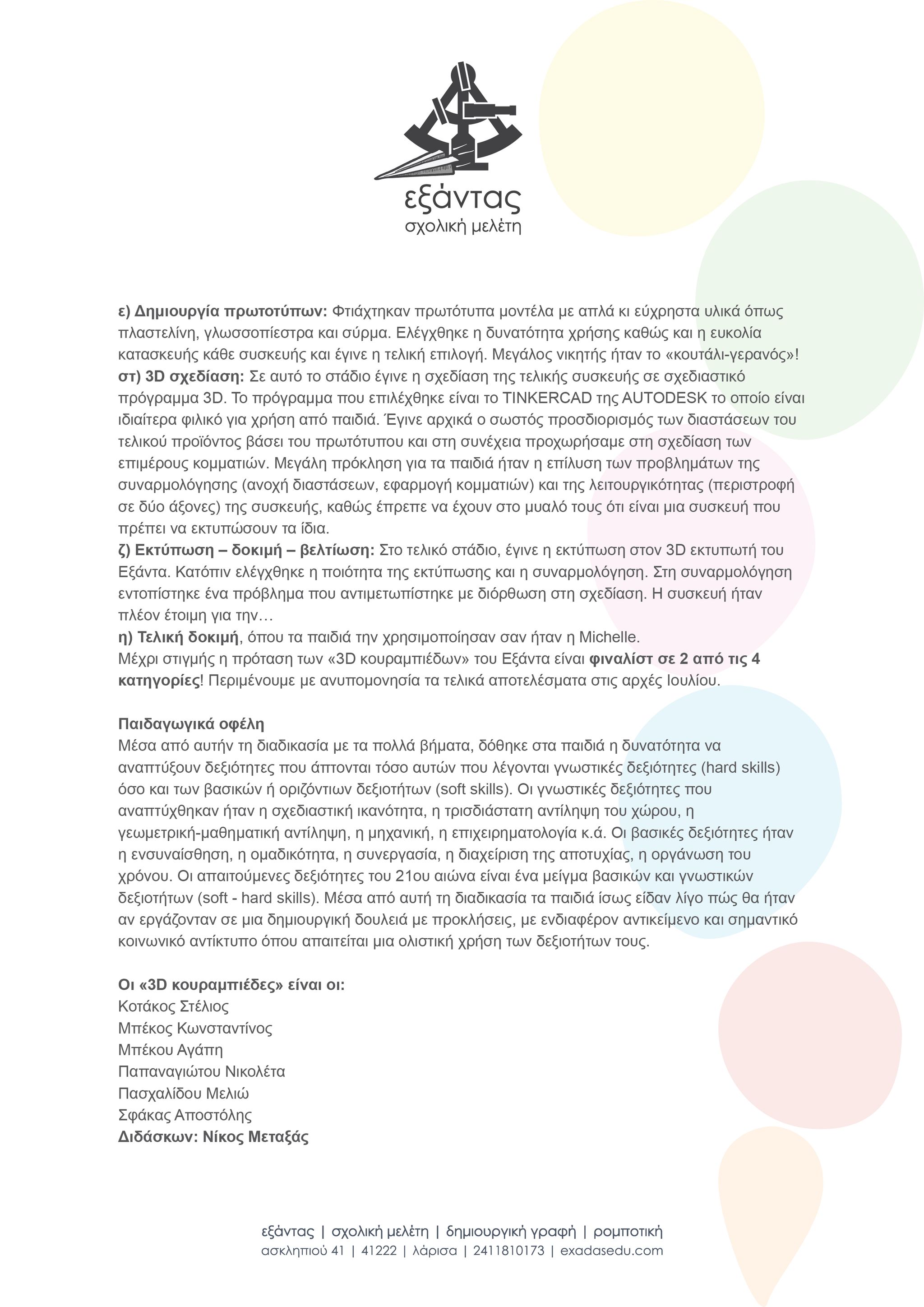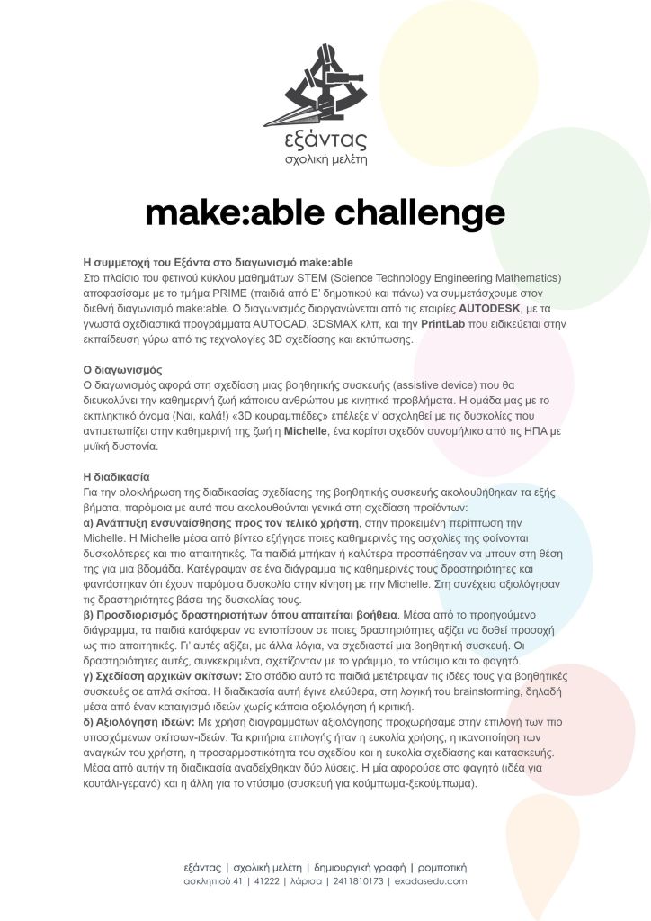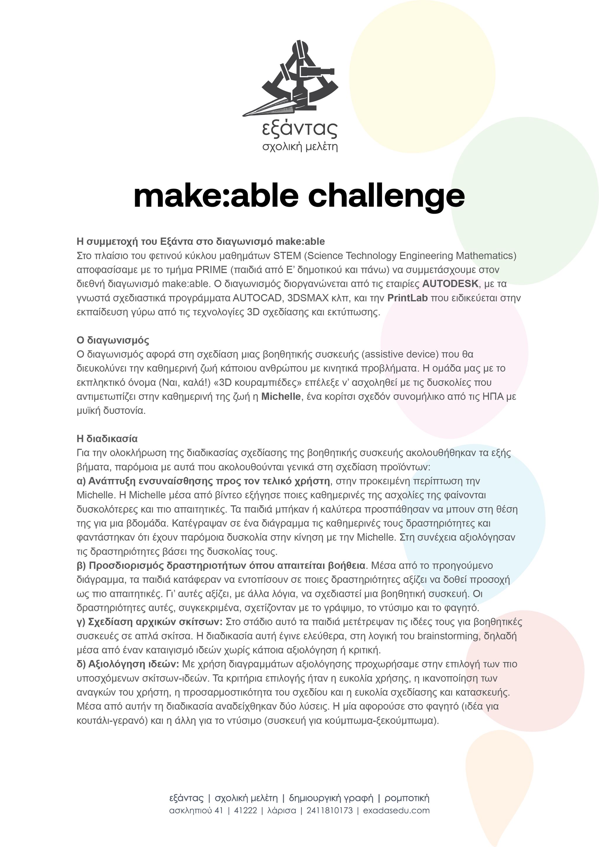 Αναδείχτηκε πρώτη στην κατηγορία «Best use of Autodesk software» στον διεθνή διαγωνισμό make:able challenge που διοργάνωσαν οι PrintLab και η Autodesk. Συγχαρητήρια στα παιδιά του Εξάντα όχι μόνο για τη διάκριση, αλλά για όλα εκείνα τα στοιχεία που διαθέτουν και τους κάνουν ούτως ή άλλως ξεχωριστούς και ξεχωριστές: τη δημιουργικότητα, την επιμονή, την εφευρετικότητα, την υπομονή, την ομαδικότητα! Είστε οι καλύτεροι και οι καλύτερες!