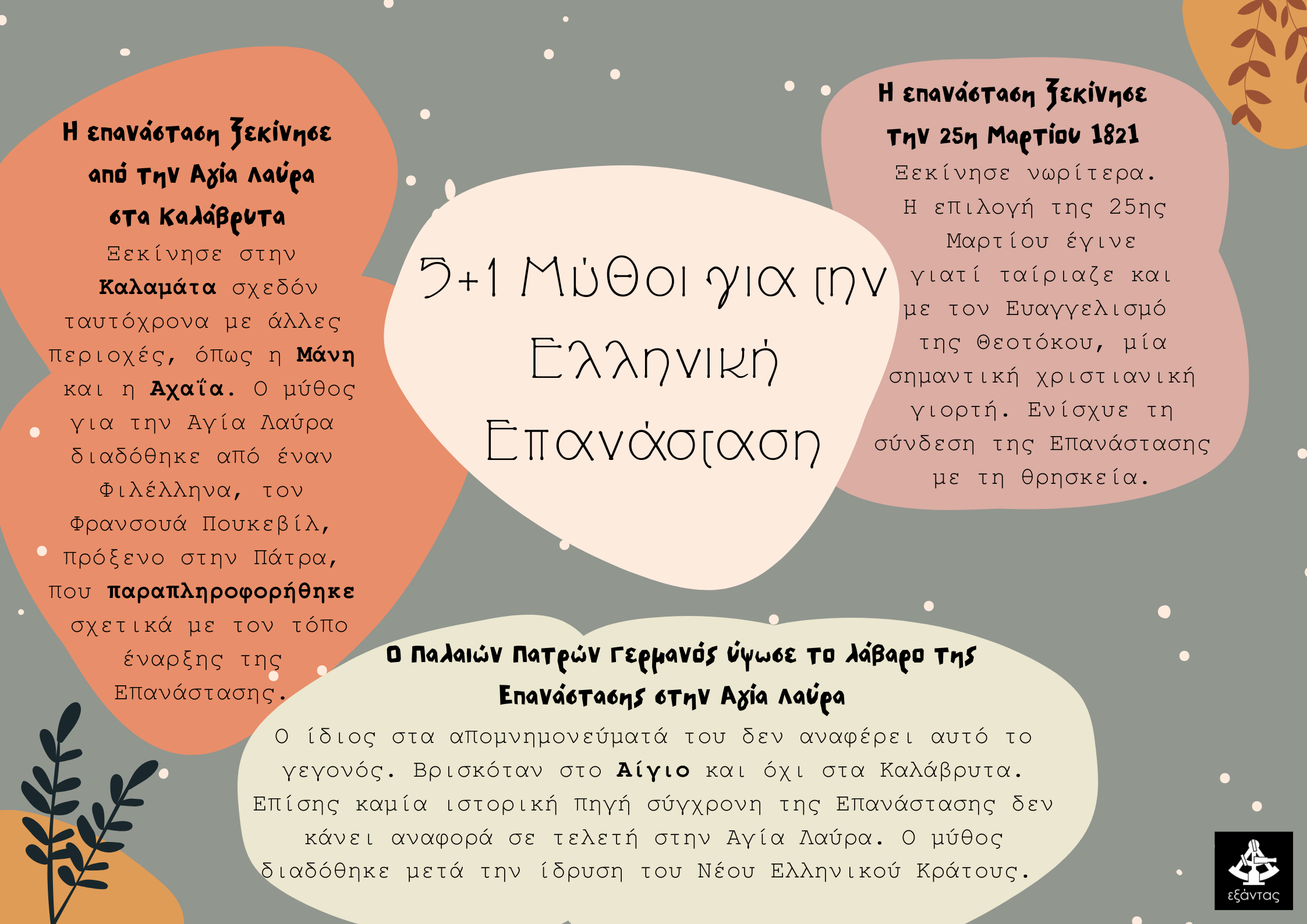 Με αφορμή την εθνική επέτειο, την εβδομάδα 24-28 Μαρτίου στα διαλείμματα των μαθημάτων του Γυμνασίου και του Λυκείου του Εξάντα, συζητάμε με τα παιδιά για έξι από τους πιο διαδεδομένους μύθους που αφορούν την Ελληνική Επανάσταση. Ποια είναι η ιστορική αλήθεια, πώς φτάνουμε σε αυτή και γιατί επικράτησαν οι ιστορικές ανακρίβειες; Αφορμή αποτελεί το πρωτότυπο οπτικοακουστικό υλικό (αφίσες και τρία βίντεο του Μουσείου Μπενάκη) που προβάλλεται στον κεντρικό χώρο του φροντιστηρίου μεταξύ των μαθημάτων.