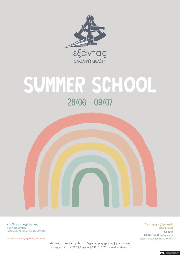Στον Εξάντα, με το τέλος της σχολικής χρονιάς για τα παιδιά του Δημοτικού, ξεκινά το Summer School, ένα πρόγραμμα διάρκειας 2μιση εβδομάδων, που απασχολεί παιδιά ηλικίας 6-10 ετών από το πρωί ως το μεσημέρι. Κάθε μέρα στο Summer School είναι θεματικά ορισμένη, με αποτέλεσμα καθημερινά να ανοίγεται στα παιδιά ένας νέος κόσμος μέσα από εκπαιδευτικές... Continue Reading →