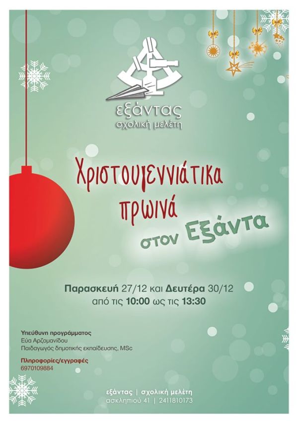 Φέτος στις γιορτές ο Εξάντας-Σχολική Μελέτη στην Ασκληπιού 41 απασχολεί δημιουργικά τα παιδιά του Δημοτικού σε ένα διήμερο πρόγραμμα που συνδυάζει τη διασκέδαση με τη γνώση. Την Παρασκευή 27/12 και τη Δευτέρα 30/12 η Παιδαγωγός Δημοτικής Εκπαίδευσης Εύα Αρζομανίδου, ο Μηχανολόγος Μηχανικός Νίκος Μεταξάς και προσκεκλημένοι συνεργάτες και συνεργάτιδες συνοδεύουν τα παιδιά σε ένα χριστουγεννιάτικο ταξίδι... Continue Reading →